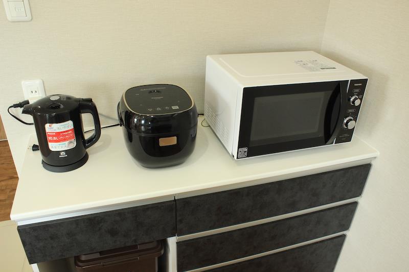 調理器具一式、お皿、電子レンジ、炊飯器、電気ケトル、掃除機付き